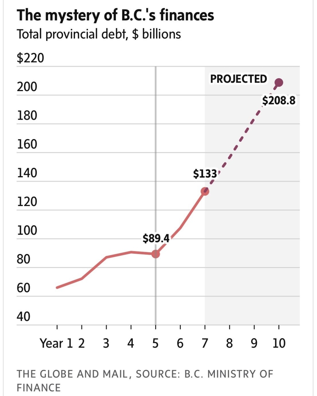 Much like the Liberal government who still haven't tabled an budget, but is widely expected the annual deficit to balloon to around $93 billion, the NDP government is definitely following those footsteps with racking up an astonishing $133 billion on the 7th year, and project to eclipse the $200 billion on the 10th year. Ontario is also on a similar trajectory. With the federal government and the two largest provinces going deep into debt, just how else can the government lower these debt without raising more taxes? And when they do, how would we just expect our next generation to have a better life, or perhaps they would just leave Canada altogether? (Source: The Global and Mail, BC Ministry of Finance)