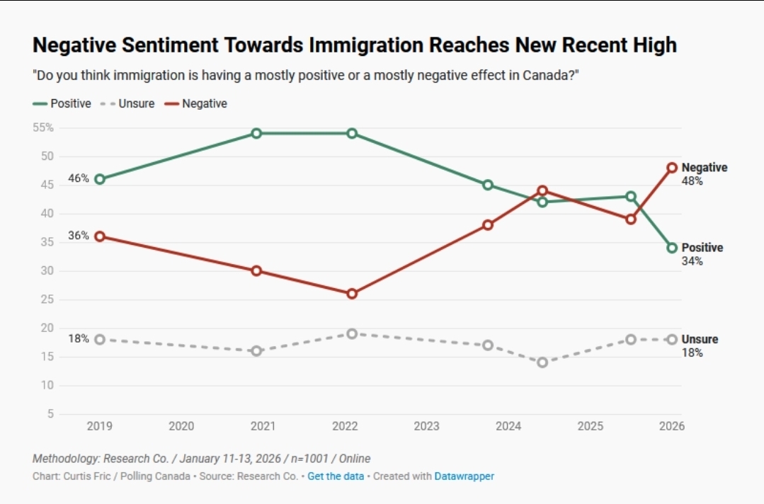 In one of the worst immigration policies imposed by the Trudeau era of letting in 3 million immigrants (roughly 7.5% of the entire Canadian population) in 3 years, we are now witnessing the aftermath. Negative sentiments towards immigrants are now reaching highs of 48%. Canadians feel the infrastructures from roads, schools, hospitals, to kids playgrounds are being overwhelmed. Just how can any country let in 3 million people without any plans or improvements to infrastructure? Also, temporarily workers continue to compete in same space as most young workers do, causing unemployment rate to rise the highest amongst youth between 18-25 years old. Canadian immigration is poised for swing to a hard right. As doors will remain shut in the near future, the Canadian economy is will also have harder time to grow with less people in it. (Source: Polling Canada, Research Co.)