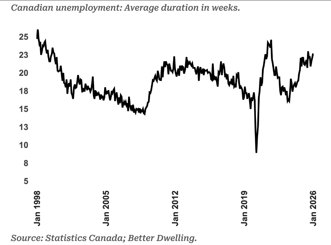 On the surface, the latest unemployment rate at 6.5% is an improvement. Diving deeper, the average duration of unemployment between jobs has jumped to 23 weeks, which is the highest since 1999 outside of the pandemic. Along the same lines as Canadian emergency room wait times are now much longer, some unemployed Canadians are also dying of impatience to get back to work. (Source: Statistic Canada, Better Dwelling)