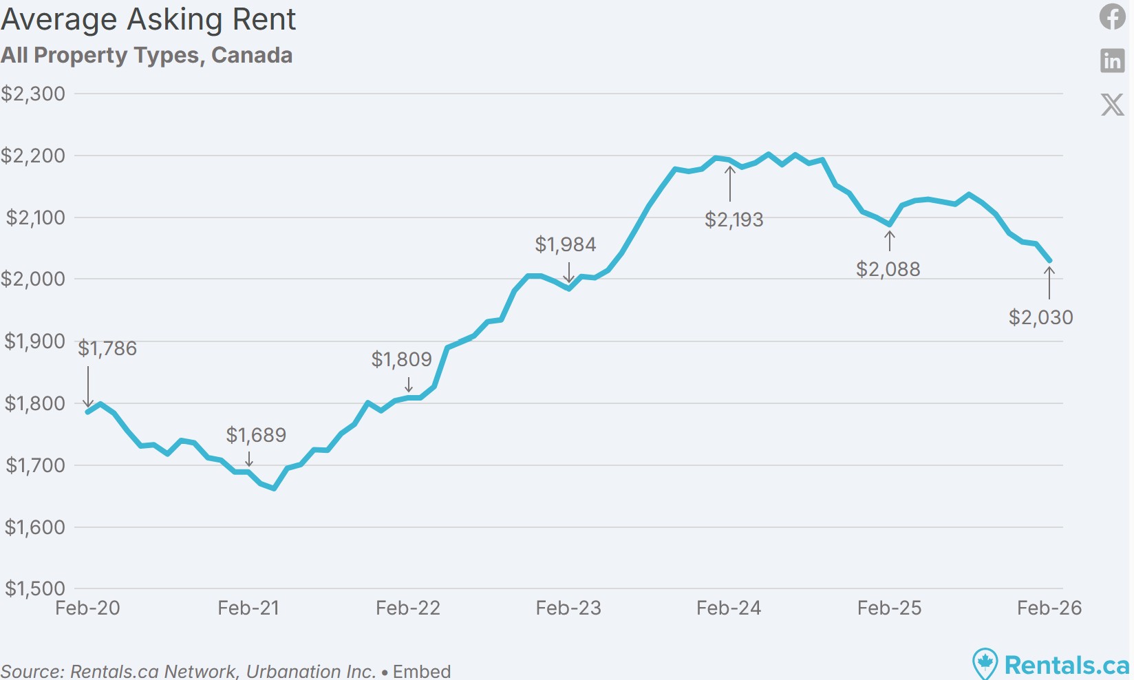 Rent in Canada has fallen on an annual basis for the 17 consecutive month, as well as falling by 1.3% on a month to month basis, which is the largest drop in February since 2020. The most populated provinces felt it the most, such as Vancouver (-4.9%), Ontario (-4.9%) and Alberta (-4.6%). The long road to rental recovery remain elusive for now. (Source: Rentals.ca)