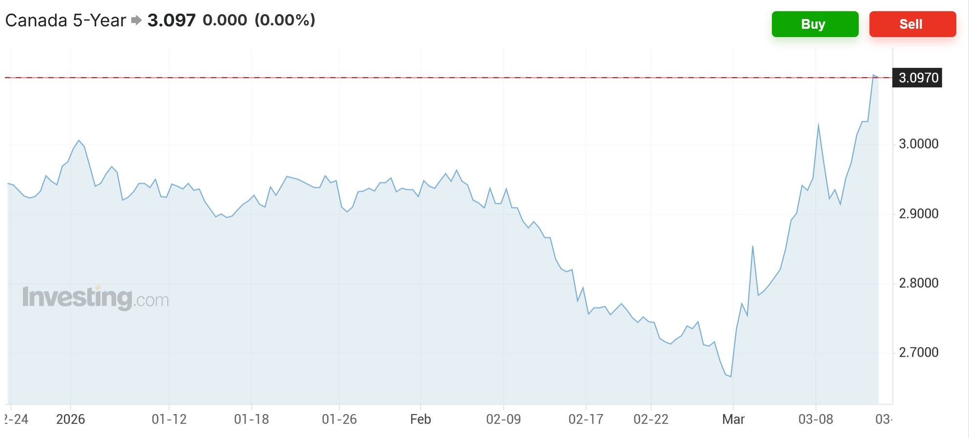 In developed countries, oil price trickles into everything. As crude oil hoovers around US $100 per barrel (March 13), there is no sugar coating the imminent spike in inflation. For this exact reason, traders of the bond yields react, causing bond prices to go up. As such, mortgage rates mirror that of the bond rates, and so we are starting to see the fixed rates (not variable rates) have climbed to the highest point in 2026. Some mortgage specialist project 5 year fixed rates will be above 4% very soon. For those who are looking, perhaps it is wise to consider locking in your rates to avoid further upward swings. (Source: Investing.com)