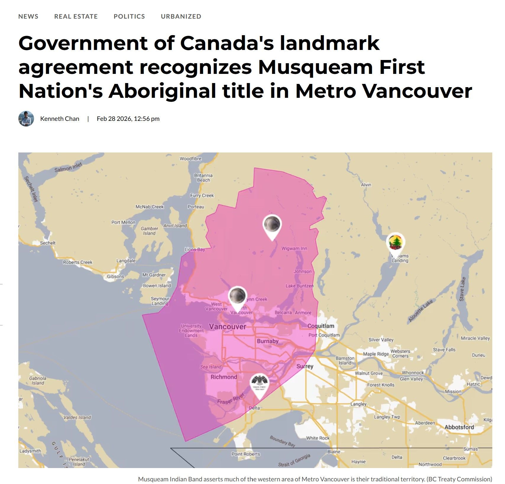 Just when Canadians are starting to forget about the First Nation land claim a few months ago, the federal government has decided to gaslight the entire BC homeowner base by agreeing and recognizing the Musqueam First Nation's aboringal land title. This means that Musqueam land title will be SUPERIOR to the private land title covering nearly all of Metro Vancouver. There are so many things wrong with this. Firstly, why was there no public inquiry before a huge decision like this was made? Secondly, even other First Nation bands such as Squamish and Tsawwassen were infuriated and has appealed the decision. So not only is the BC NDP government on a suicide mission, but so is the federal government. Worst part is, this was all done in secrecy and nobody found out until it's signed and sealed. (Source: DailyHive.com)